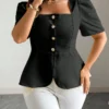 Blouse ajustée élégante à manches courtes bleue avec décoration de perles tressée