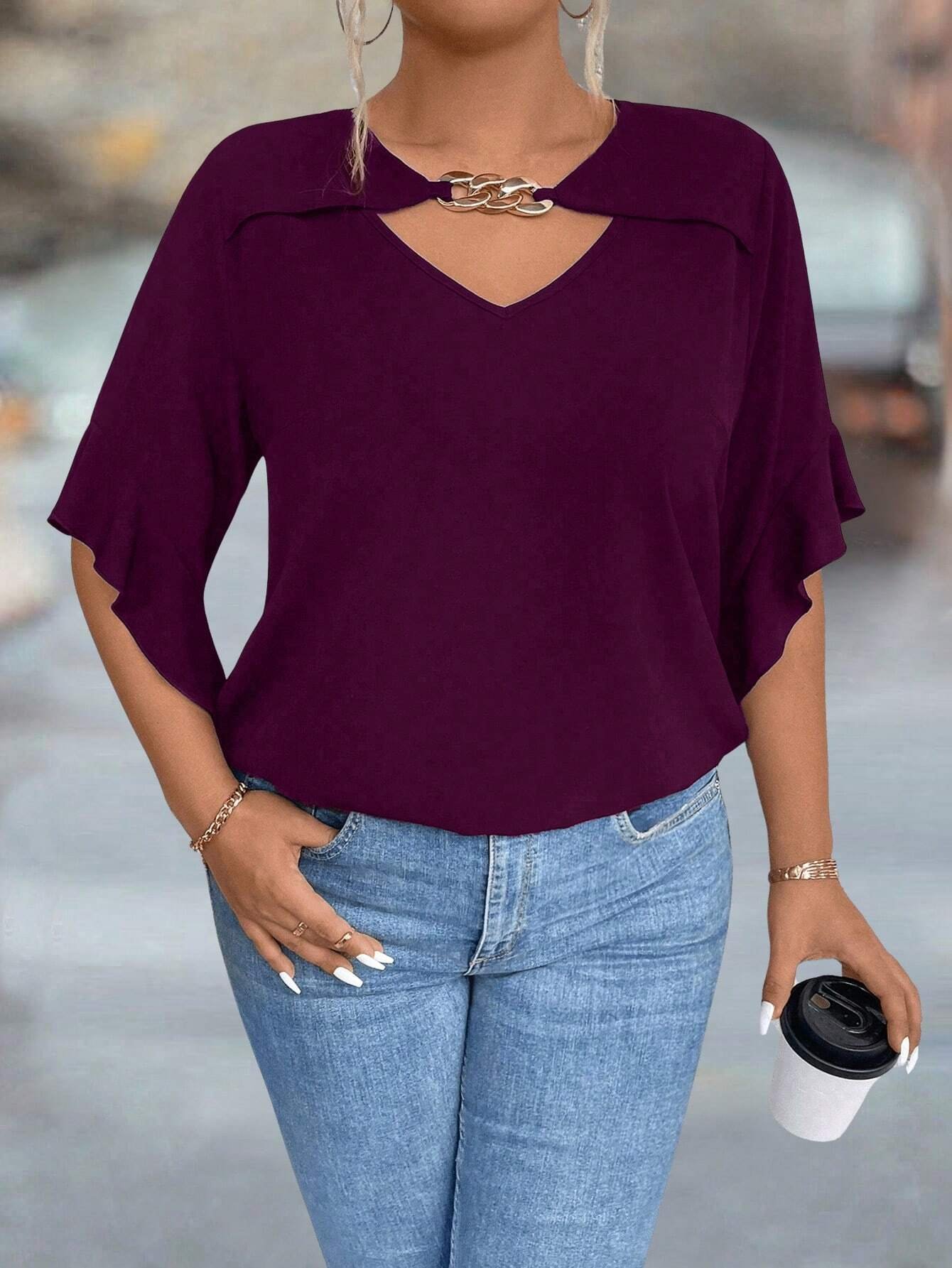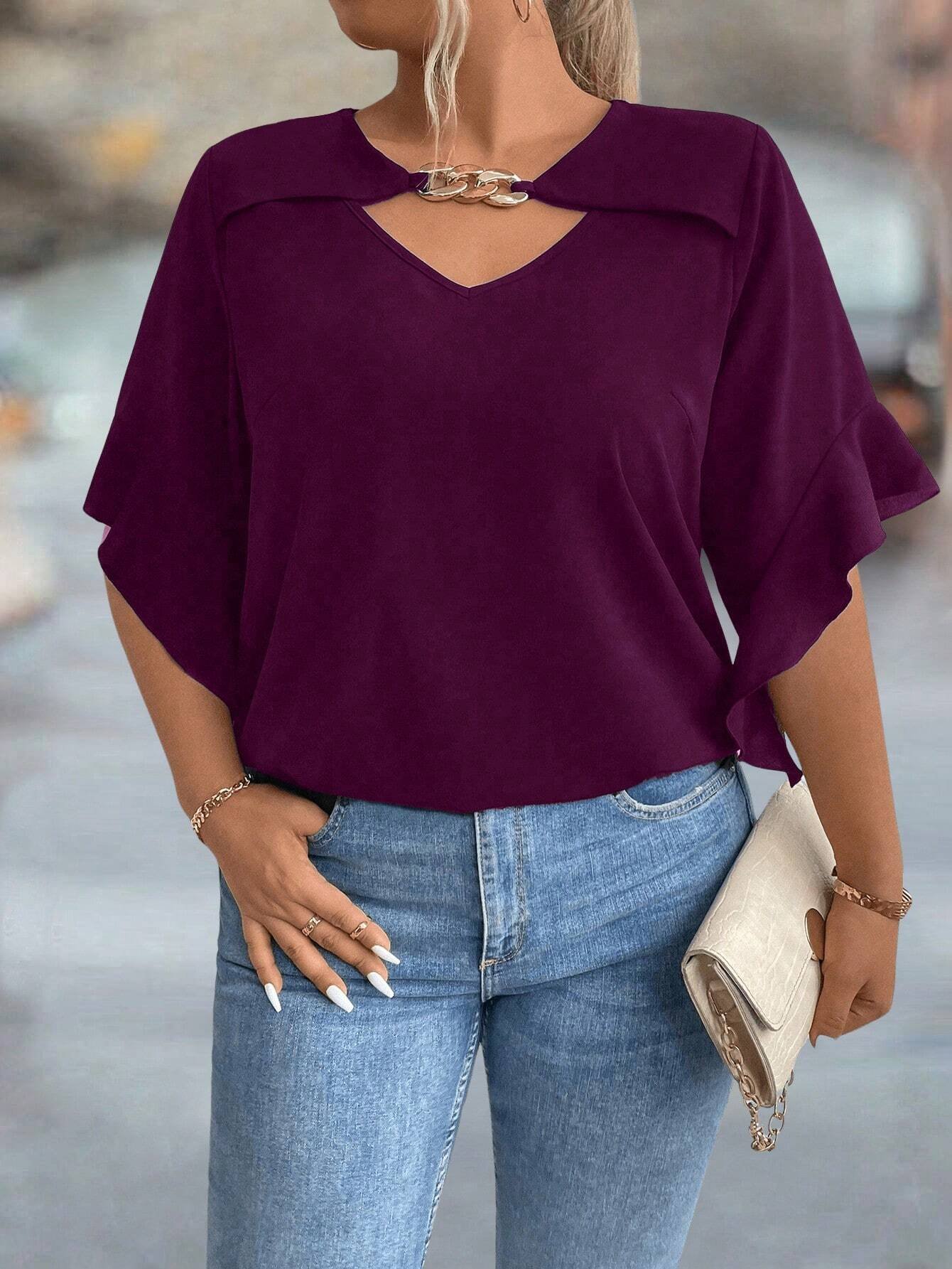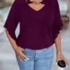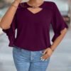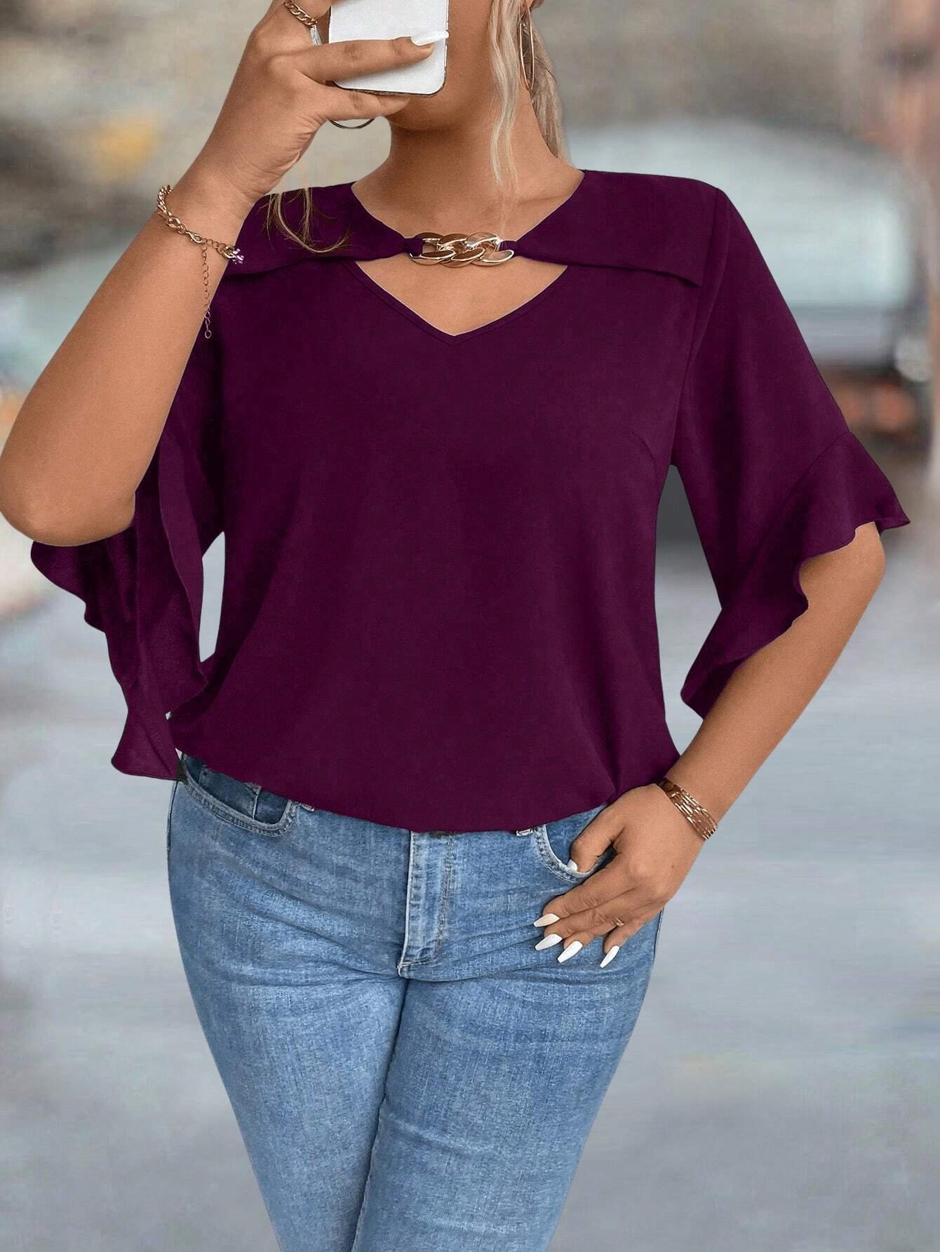 Blouse unie avec col évidé et volant aux poignets