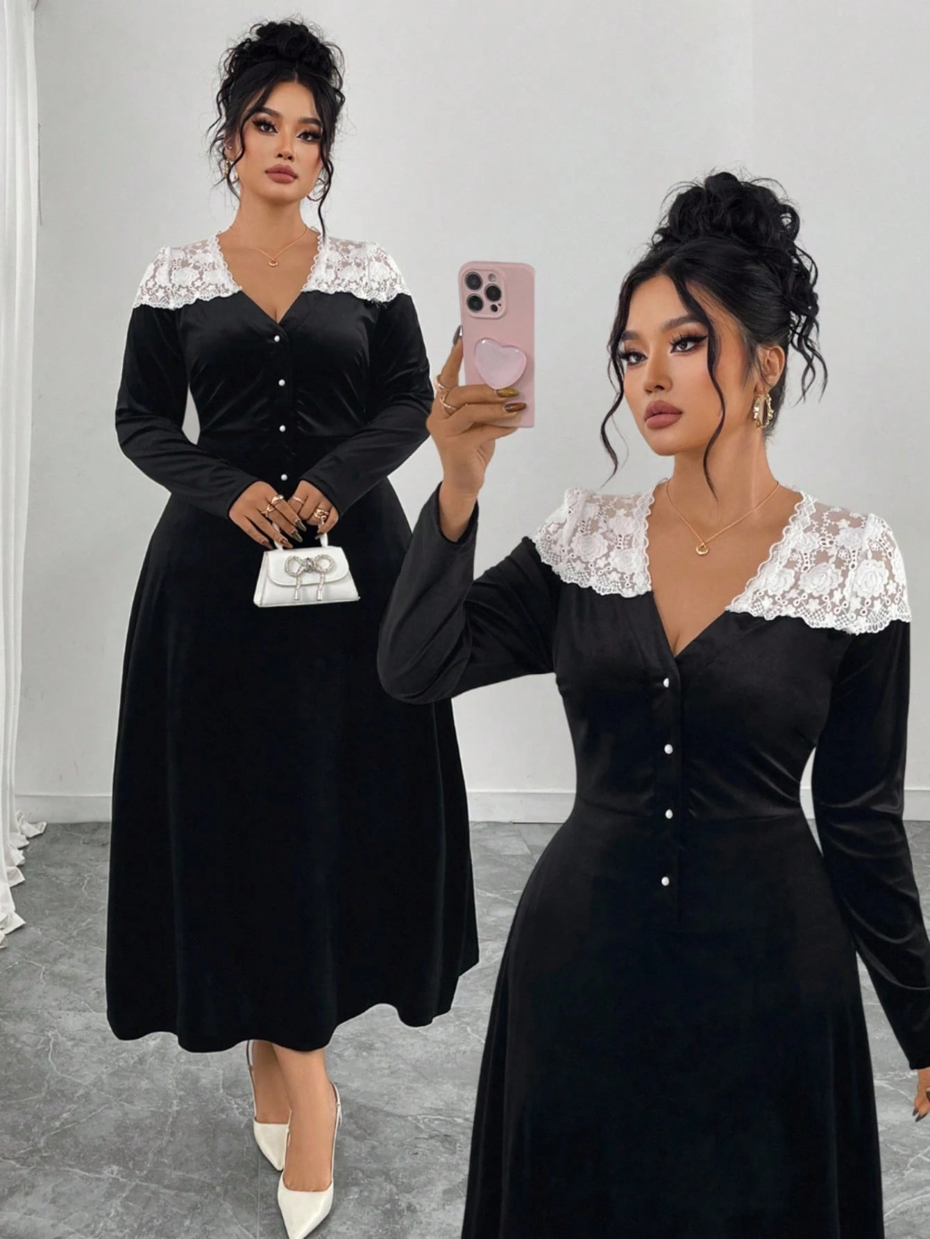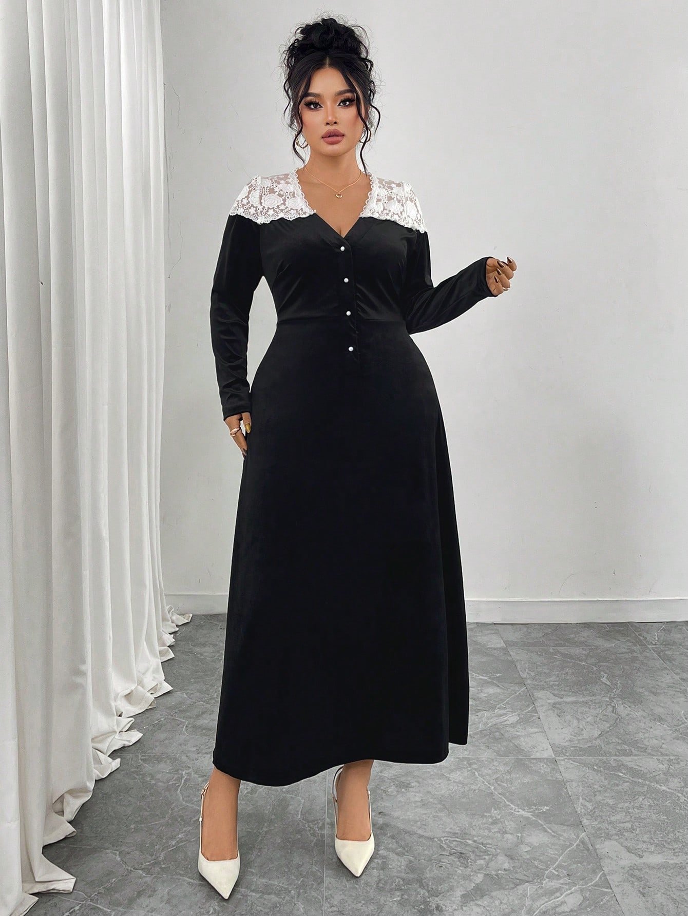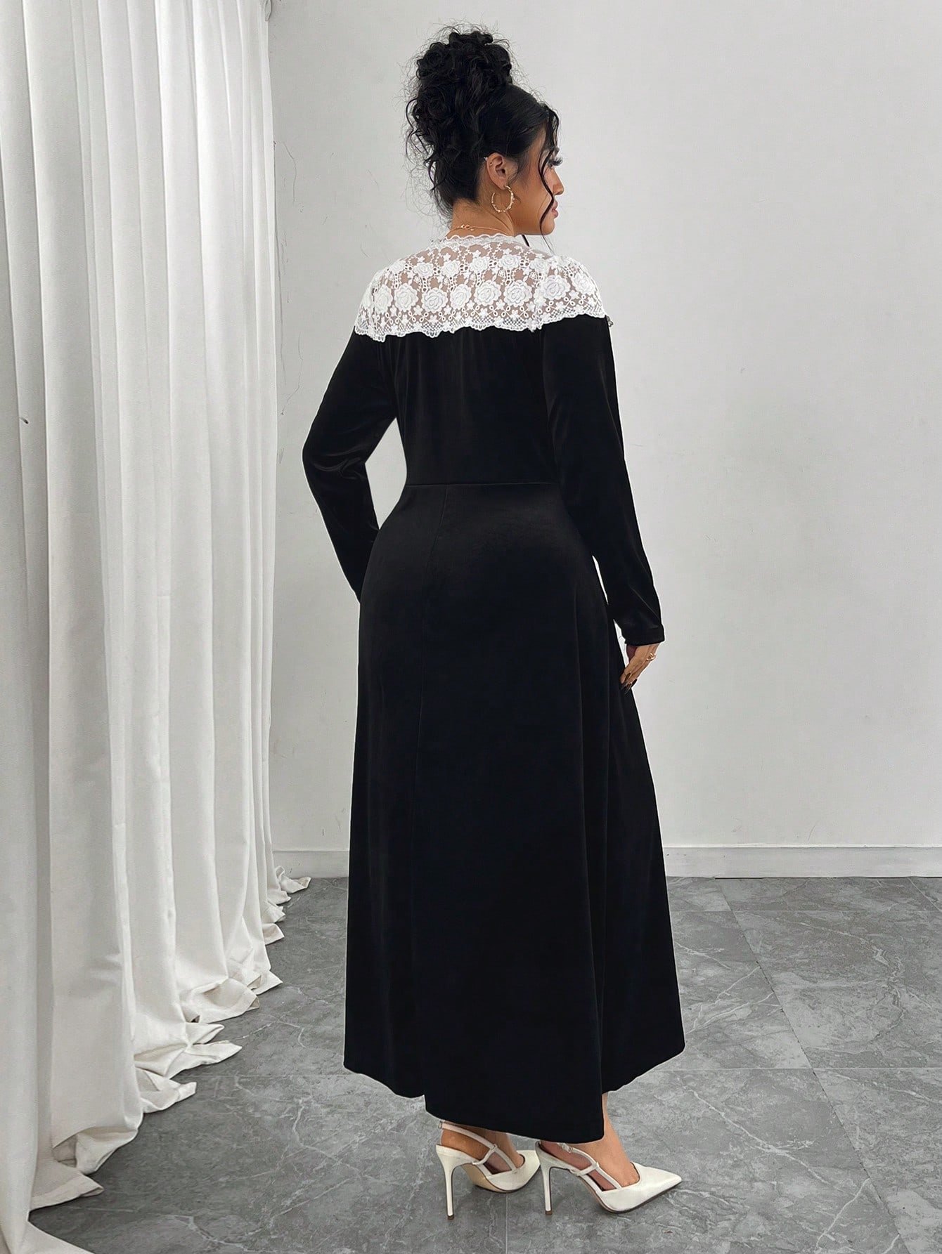Robe élégante avec blocs de couleurs, manches lanternes à col en V profond et ourlet sirène