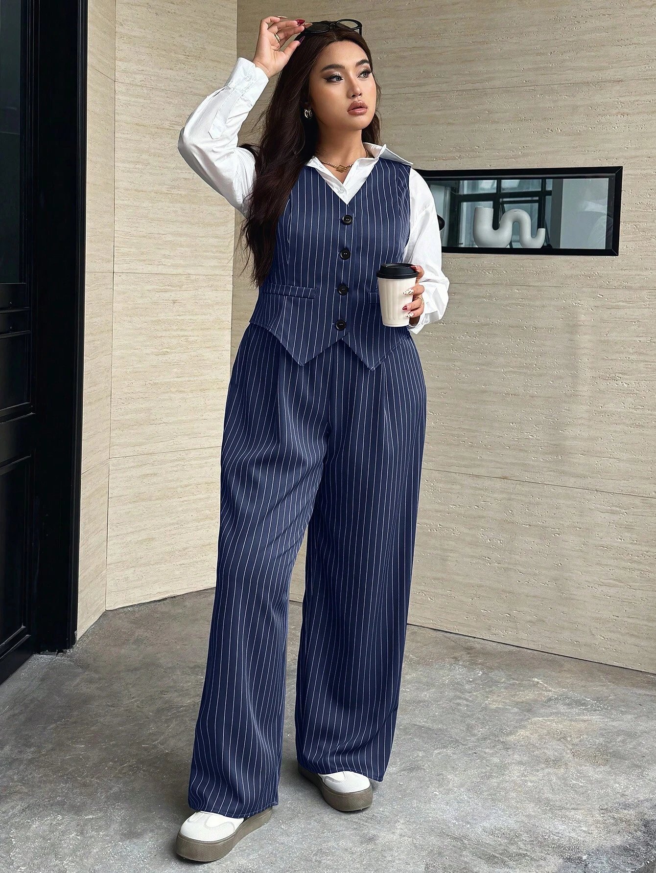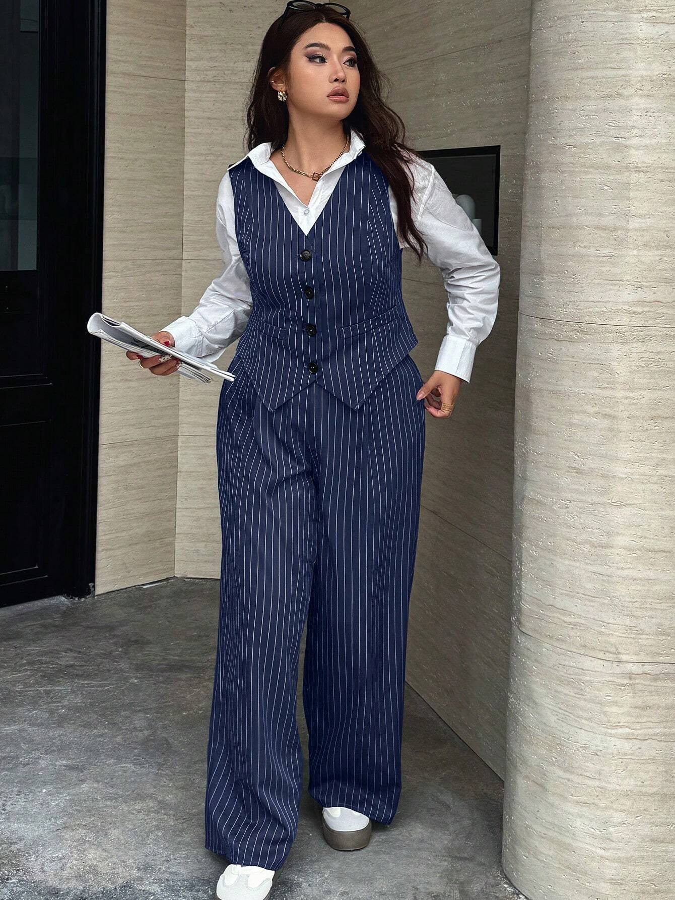 Ensemble de 2 pièces pour femmes grande taille, composé d’un gilet à rayures simple boutonnage et d’un pantalon, tenue décontractée convenant pour le travail et le quotidien