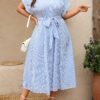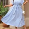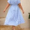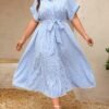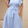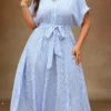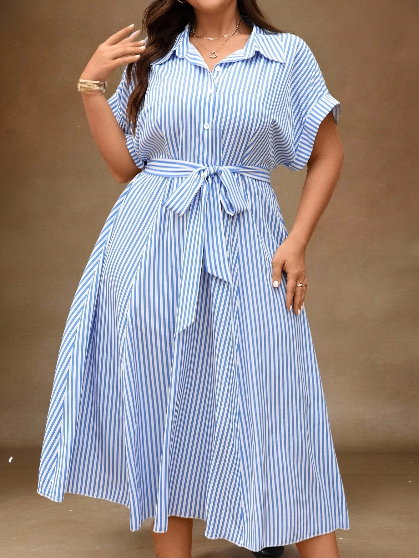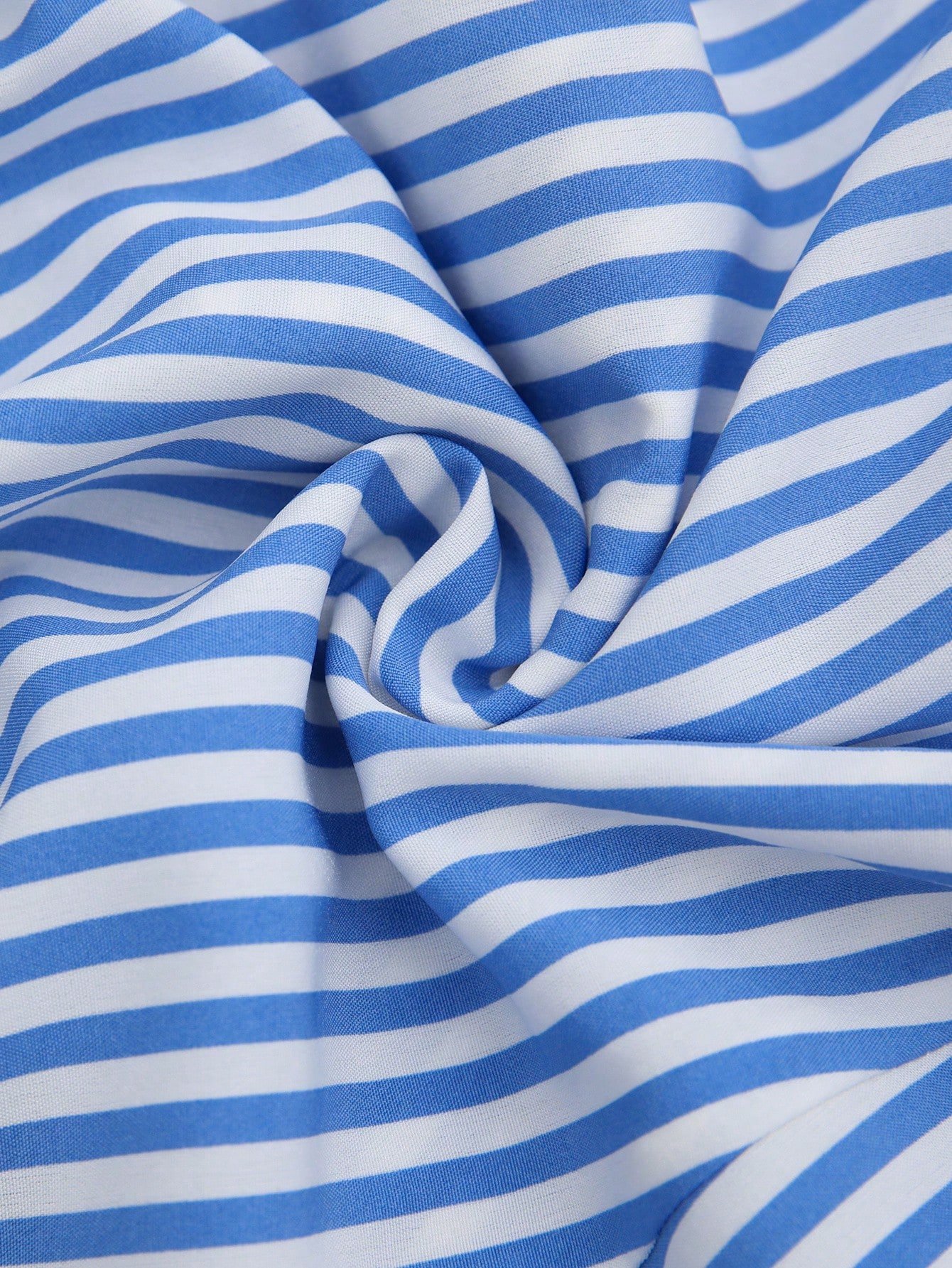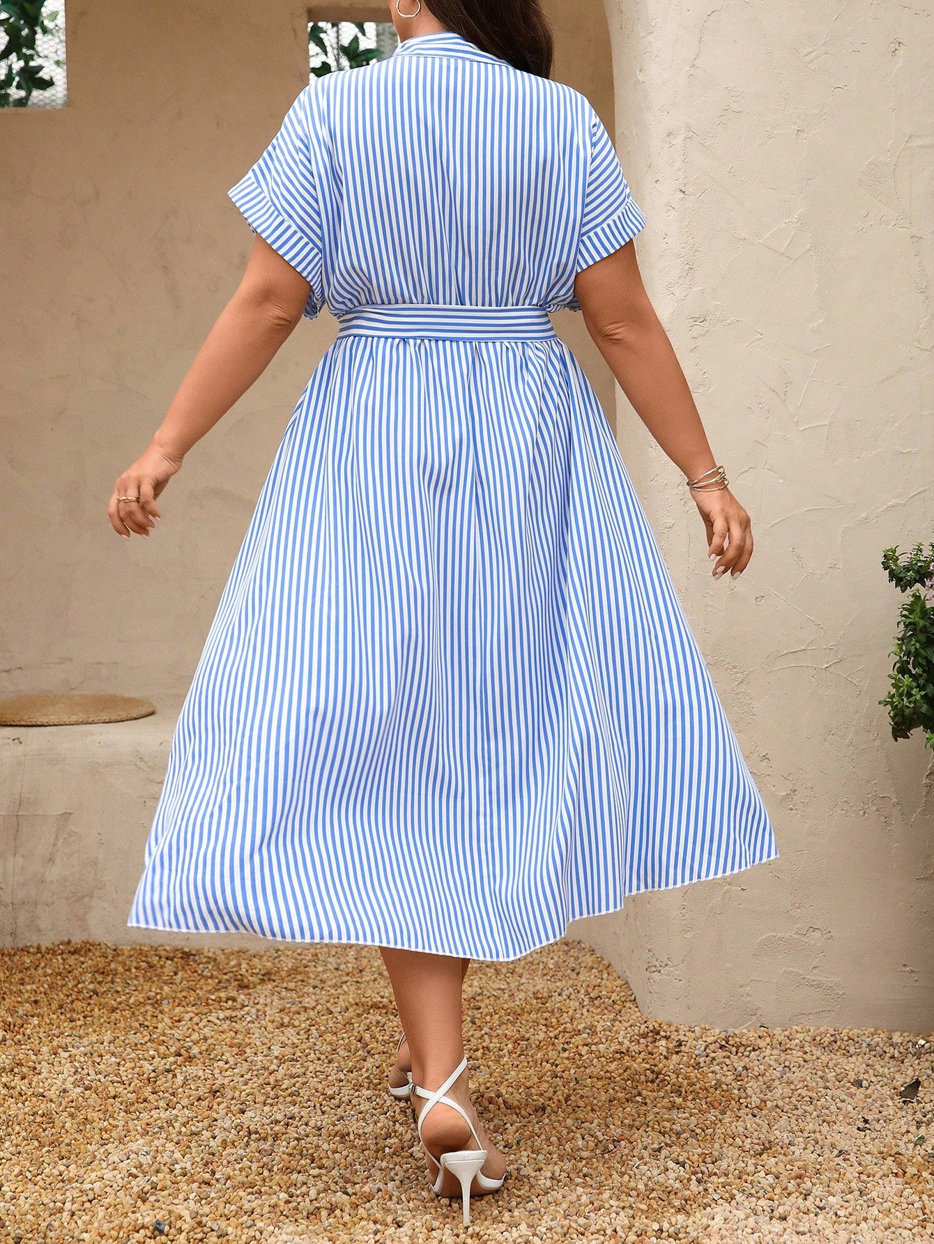 Robe à col à revers boutonné avec jupe évasée à rayures bleu et blanc