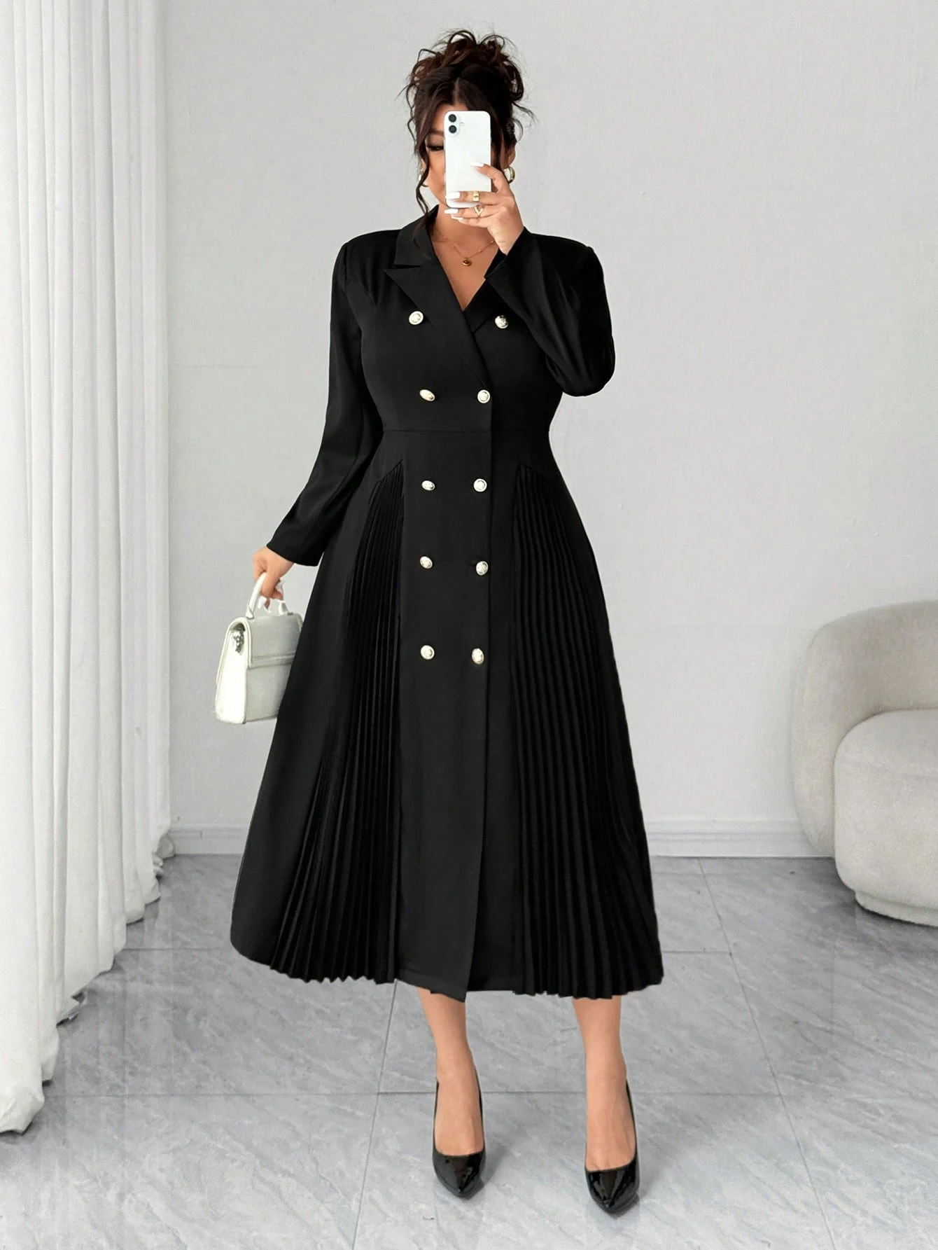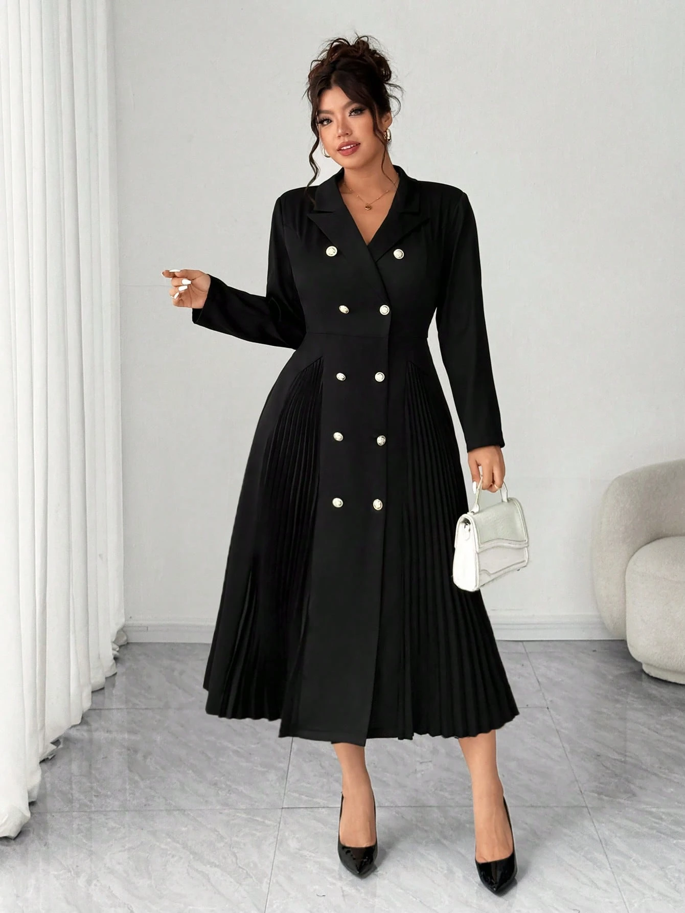 Robe ajustée à manches longues, col, double boutonnage et plis