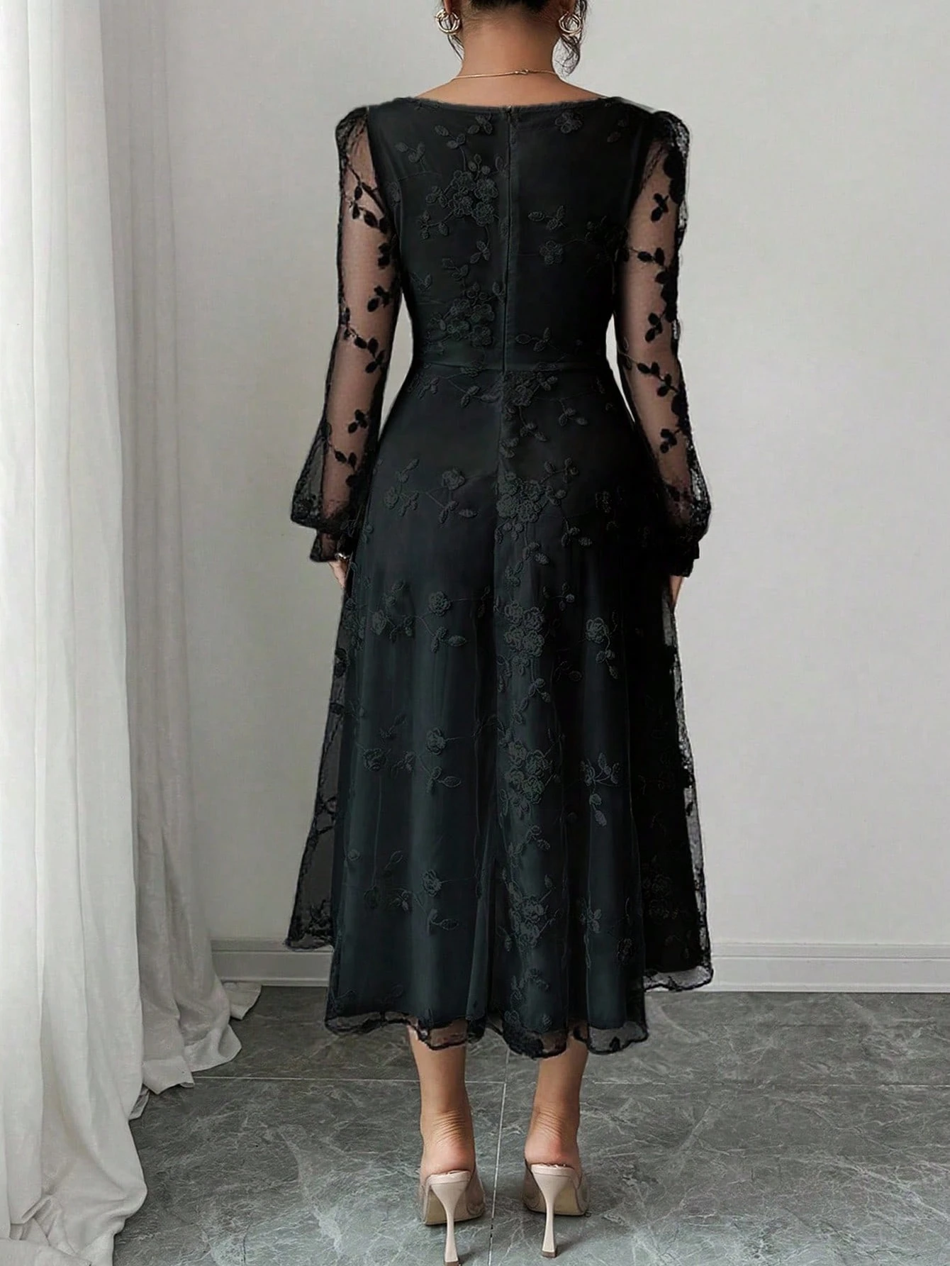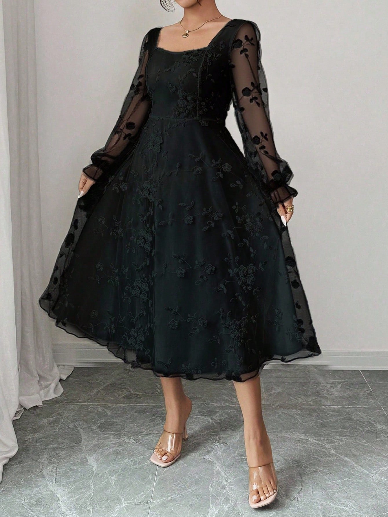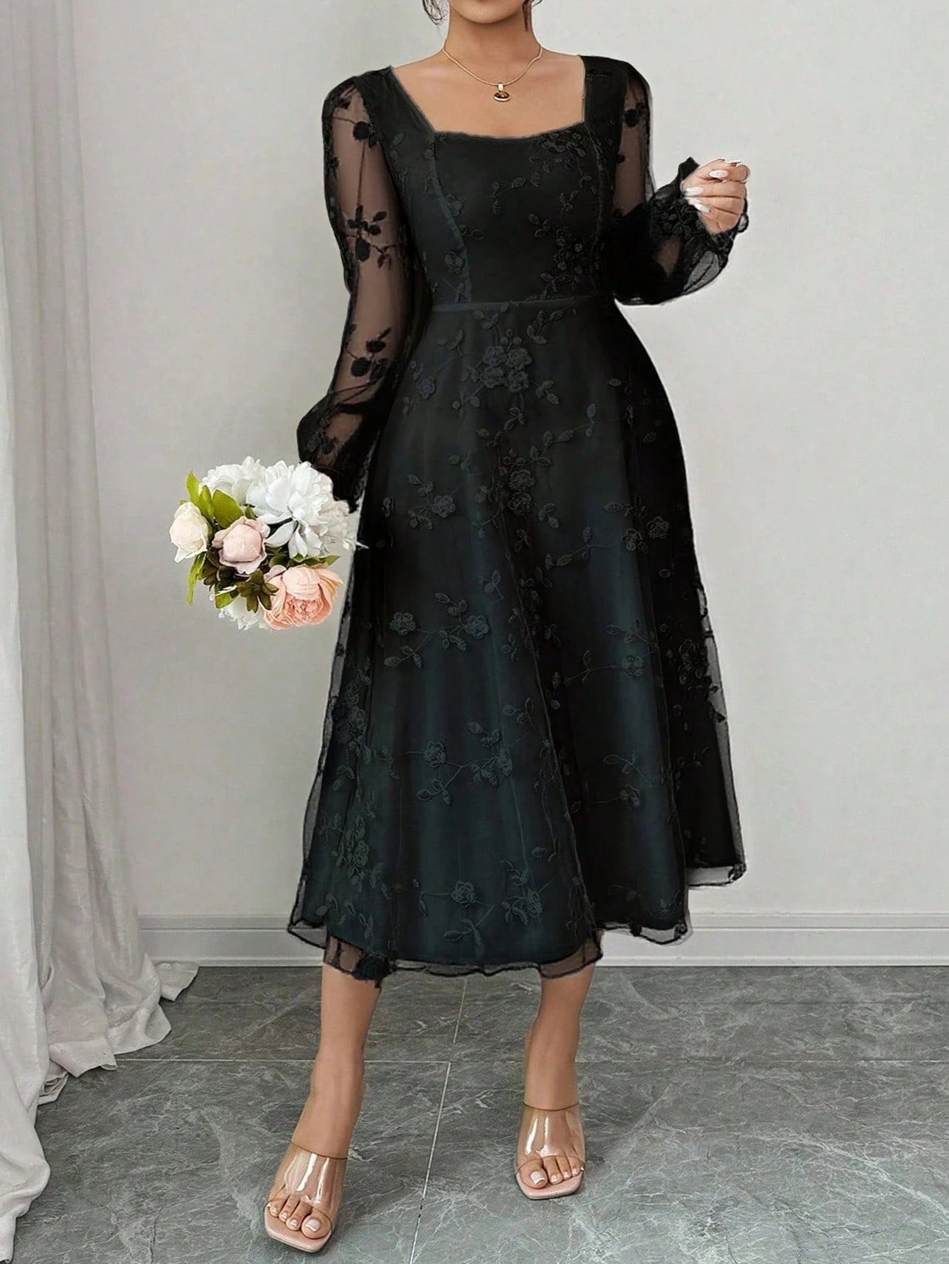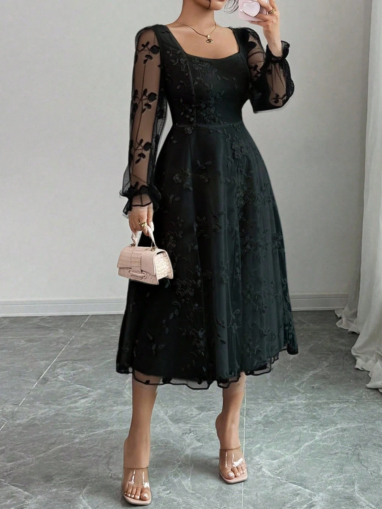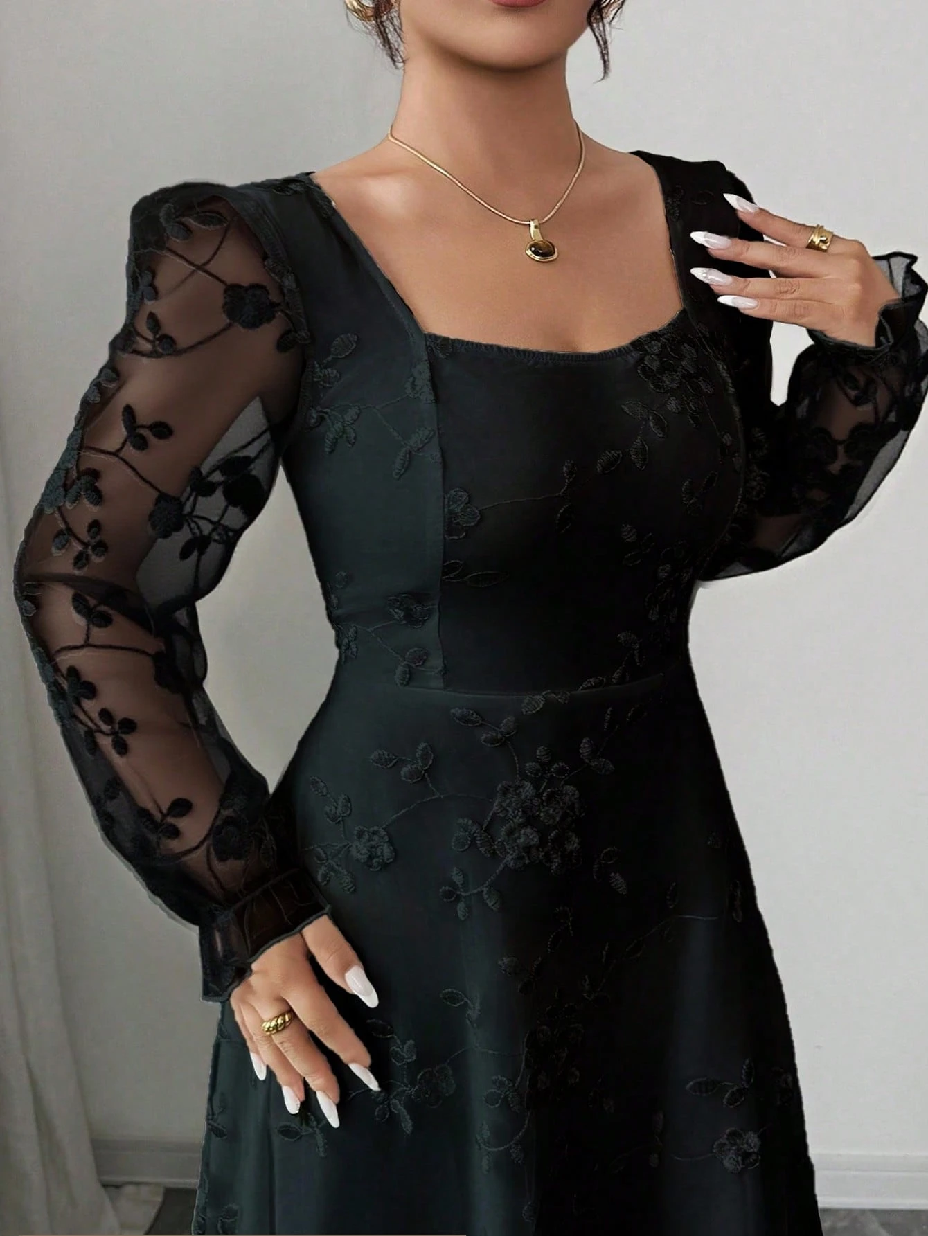 Robe élégante avec contraste de maille, col carré et taille cintrée