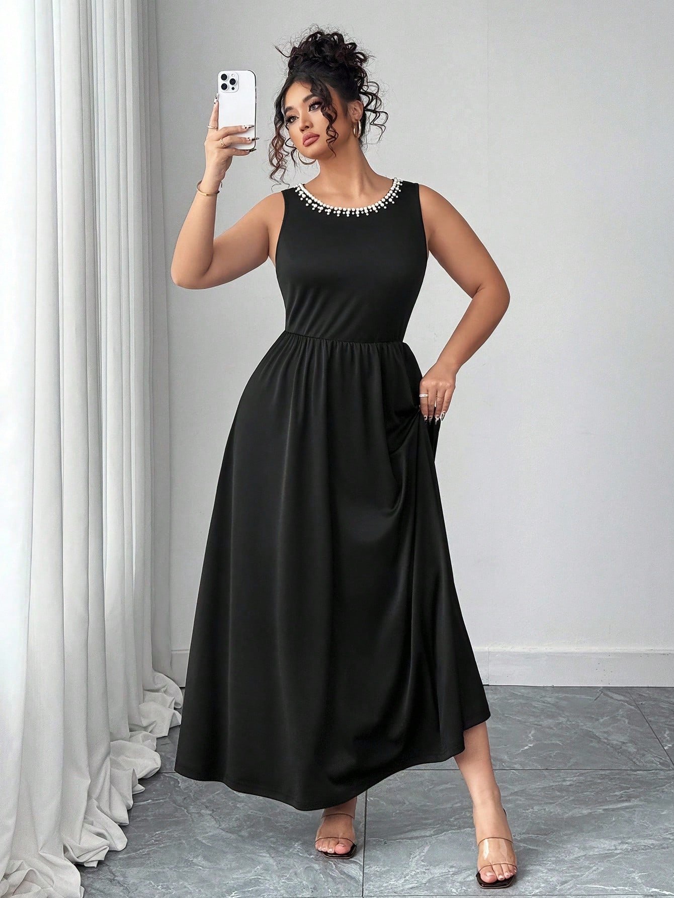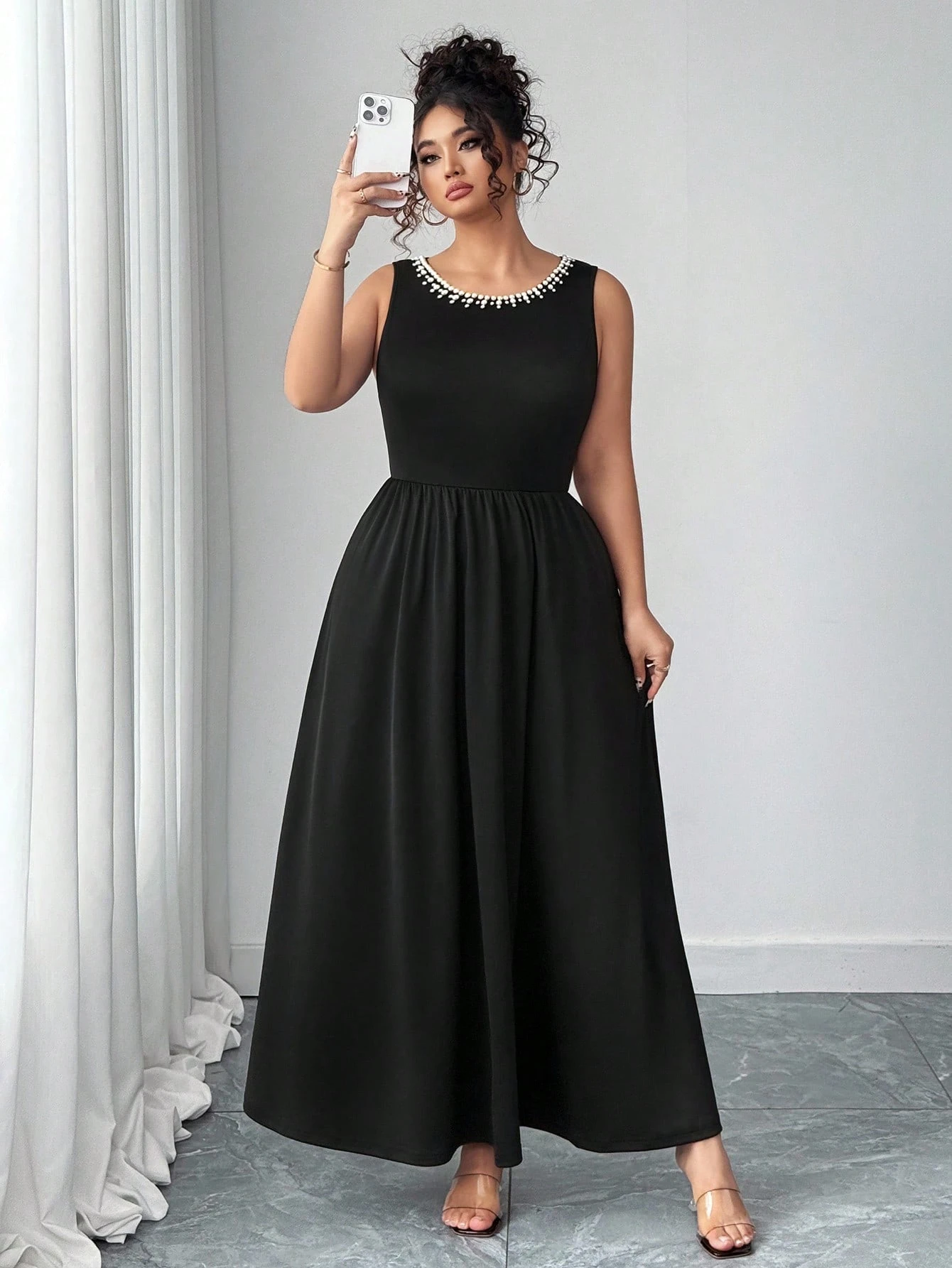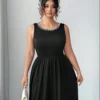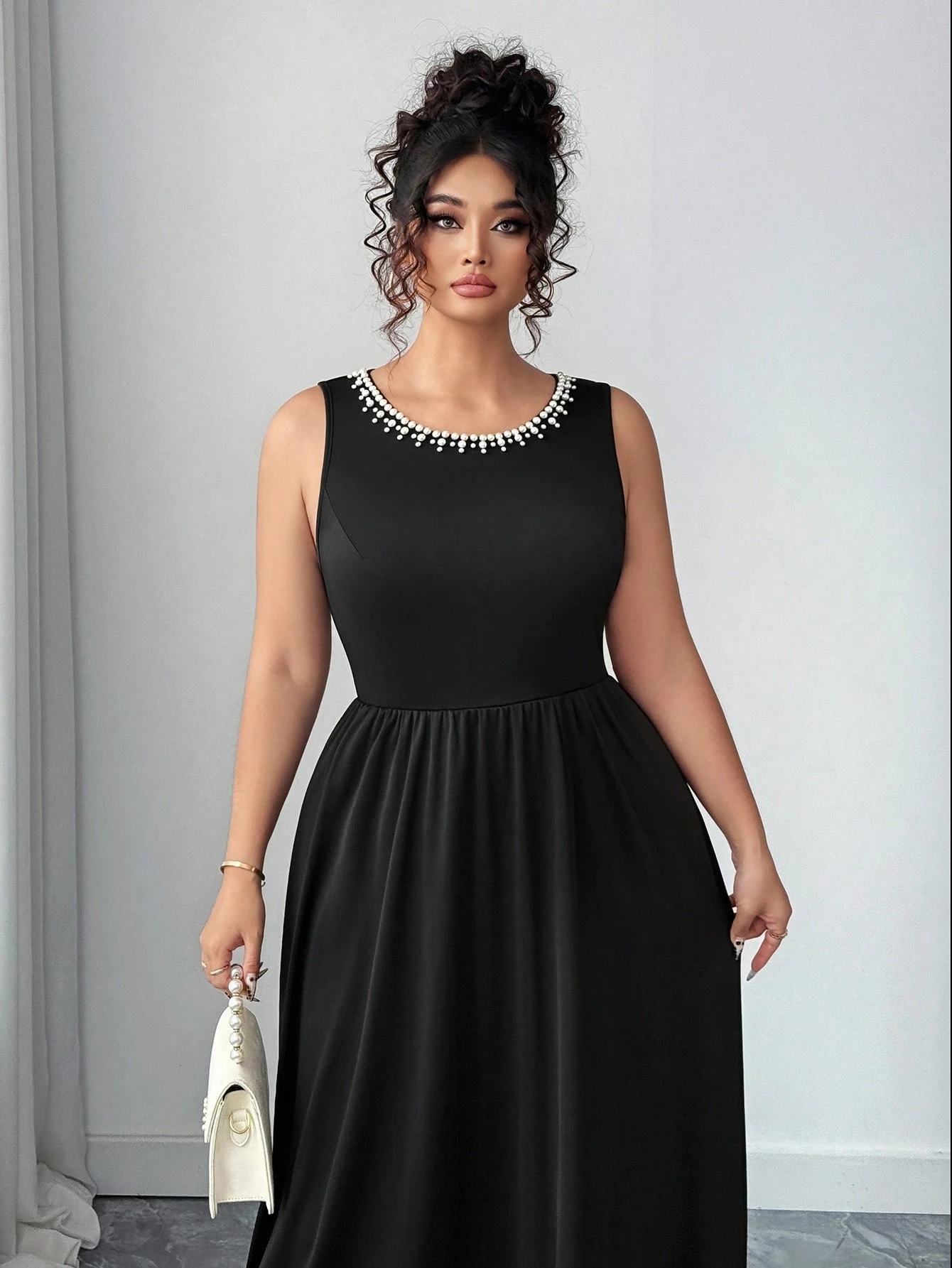 Robe élégante noire en tricot moulant avec garniture de perles sans manches