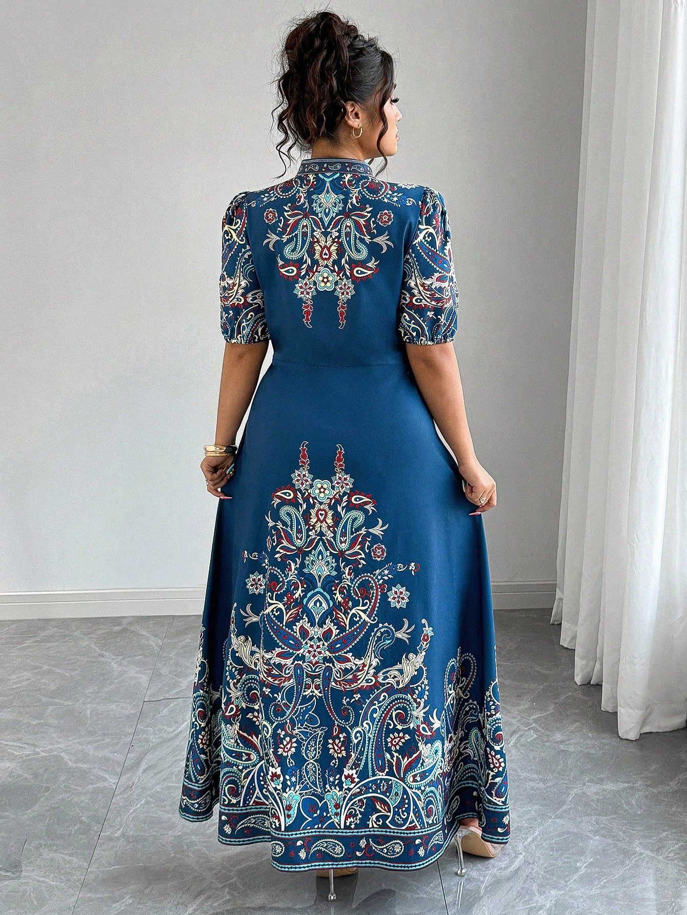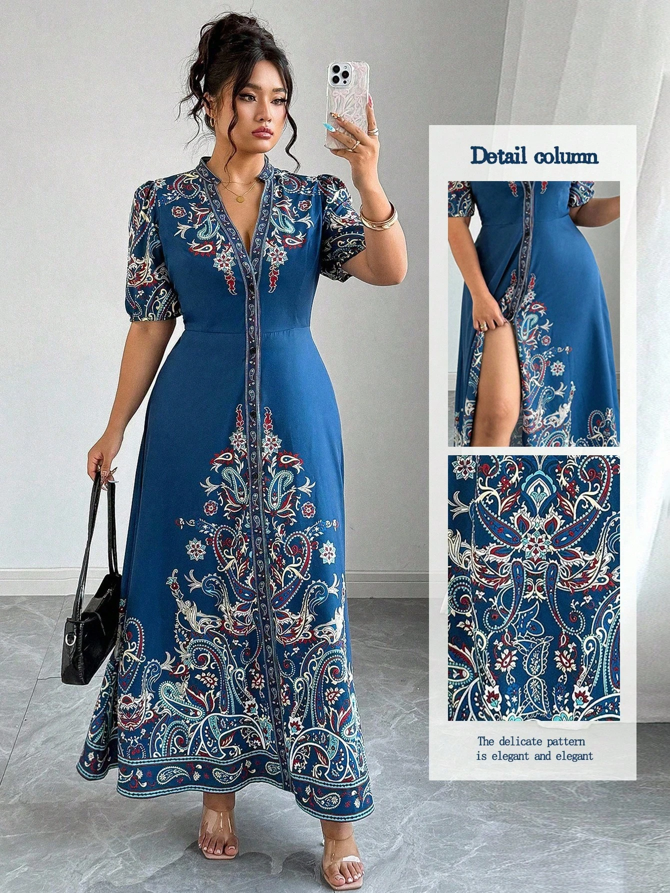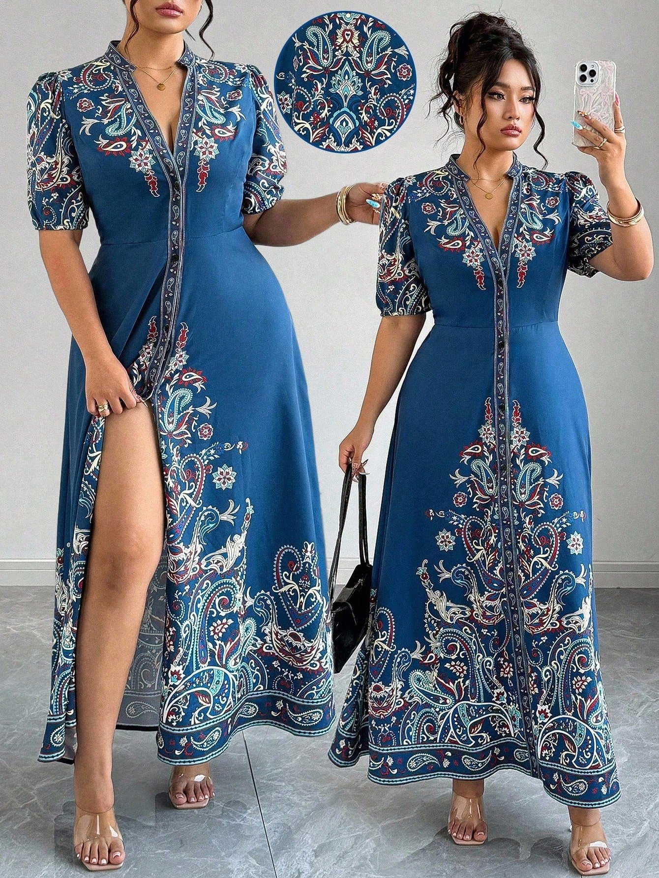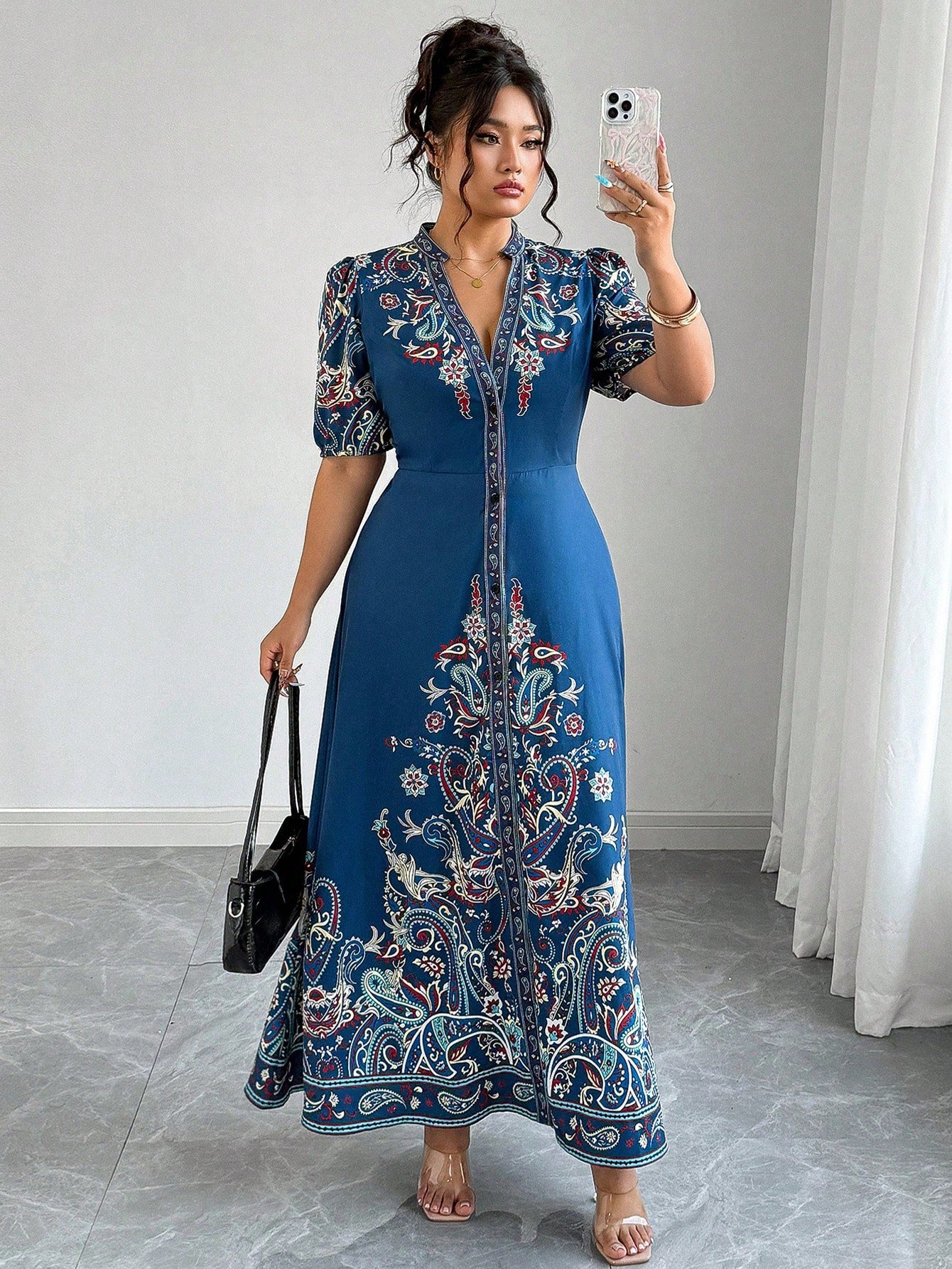 Robe longue décontracté/de villégiature style bohème imprimée à col en V, manches courtes