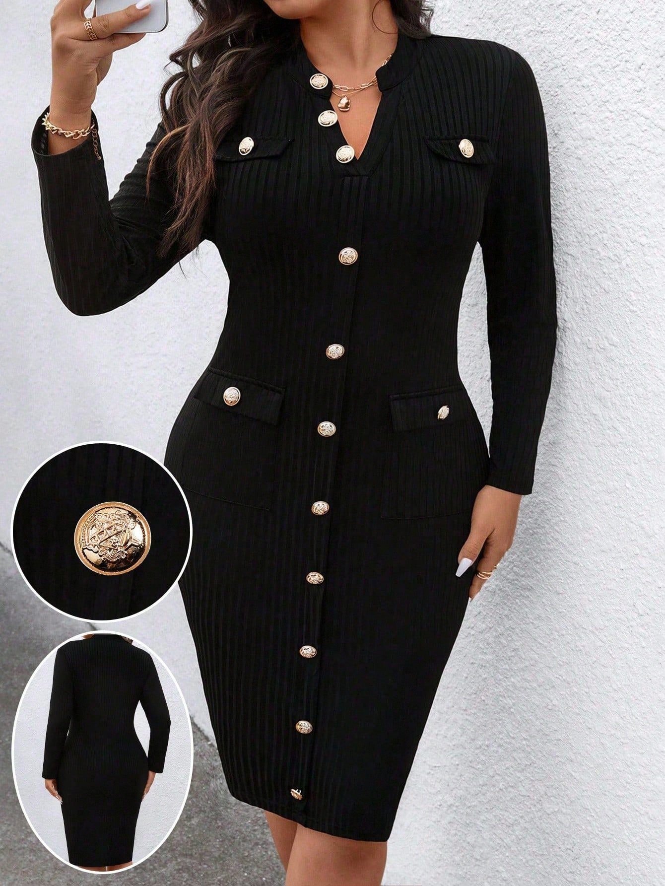 Robe mi-longue ajustée à col V boutonnée