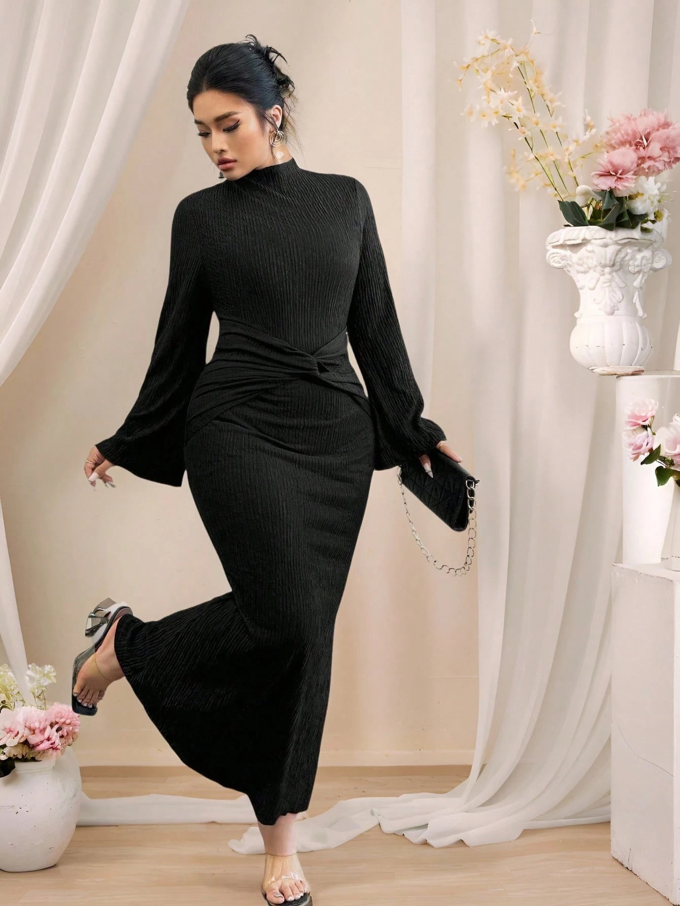 Robe noire élégante à col montant,